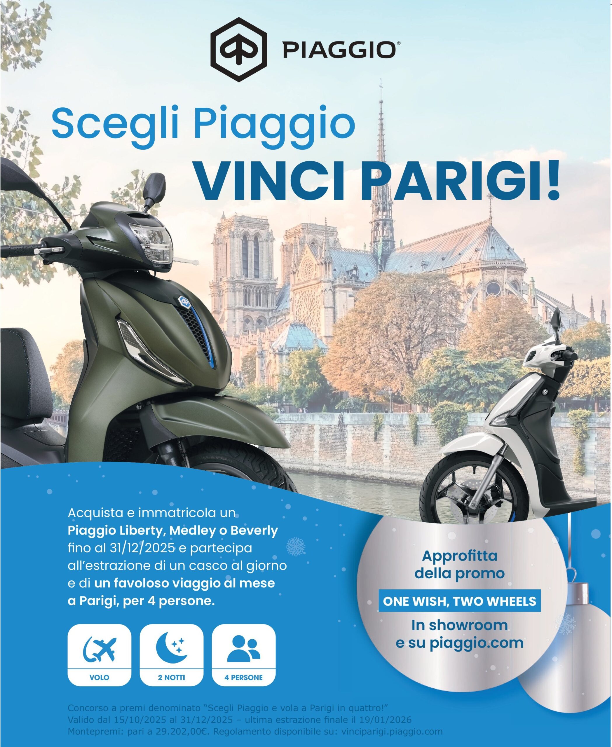**Offerta valida per veicoli immatricolati dal 01/12/2025 al 31/12/2025 sul prezzo di listino consigliato franco concessionario presso la rete di vendita ufficiale Piaggio che aderisce all’iniziativa. La promozione prevede 300€ di vantaggi riconosciuti attraverso varie possibilità, anche combinate tra loro, come ad esempio contributo sul prezzo f.c consigliato della gamma Liberty over 50cc Euro5+, sconto sull’acquisto di accessori, abbuono delle spese di immatricolazione, assicurazione compresa nel prezzo f.c consigliato del veicolo. Non cumulabile con eventuali ulteriori promozioni presenti dal concessionario. Maggiori informazioni su www.piaggio.com.